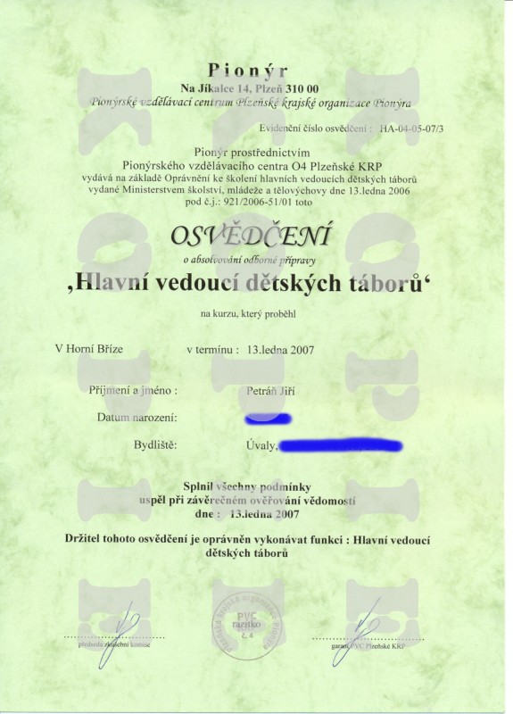 Držitel Osvědčení o absolvování odborné přípravy "Hlavní vedoucí dětských táborů", garantované MŠMT. Číslo osvědčení: HA-04-05-07/3