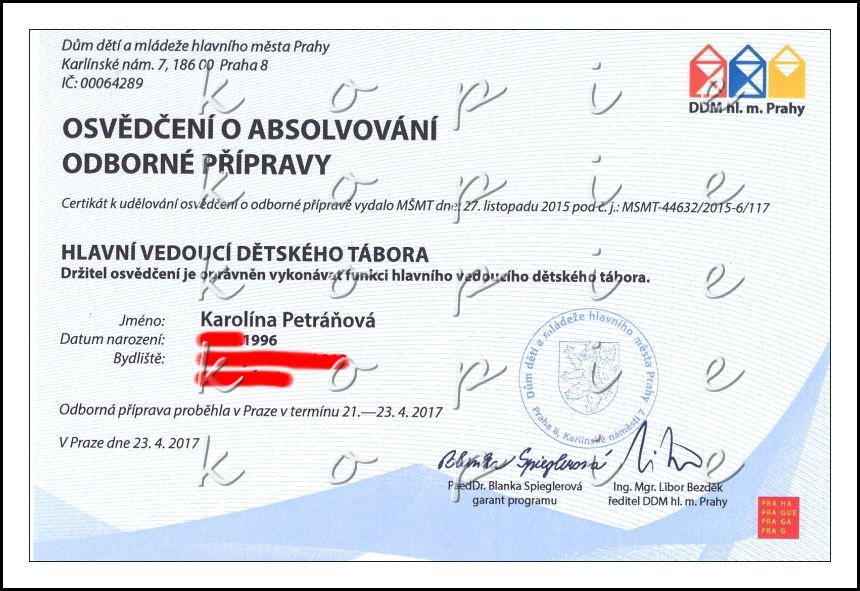 Držitelka Osvědčení o absolvování odborné přípravy "Hlavní vedoucí dětských táborů", garantované MŠMT.